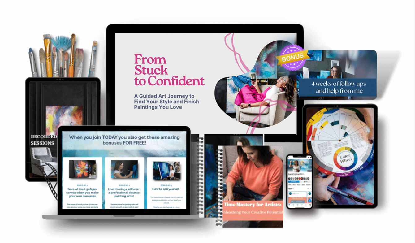 Start at just $49/month—or join for a full year ($490) and get From Stuck to Confident FREE! ✅ Enjoy monthly painting sessions, mindset support, and a loving art community.